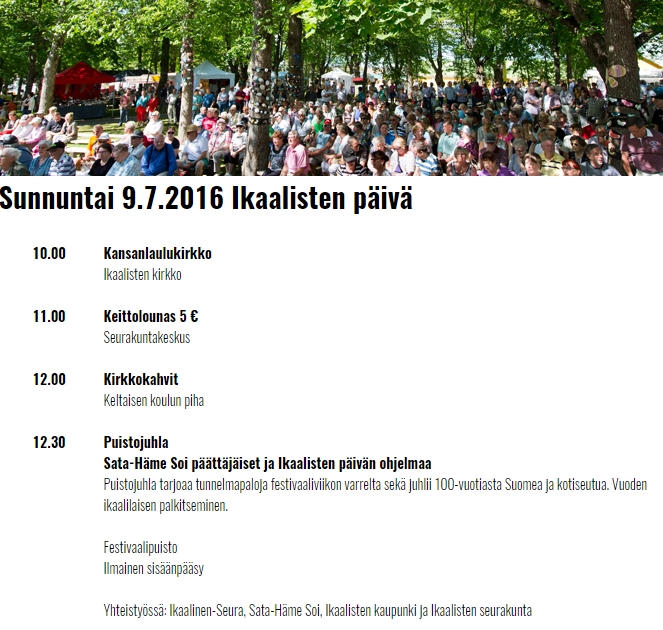 Ikaalisten päivää vietetään sunnuntaina 9.7. osana Sata-Häme Soi -festivaalia. Katso ohjelmatiedot Sata-Häme Soin sivuilta. Sata-Häme Soin päättäjäiset jatkuvat välittömästi Ikaalinen-Seuran mielenkiintoisella ohjelmaosuudella. Tapaamisiin Turkinpuistossa, tehdään tänä suvena yleisöennätys satavuotiaan Suomen kunniaksi!